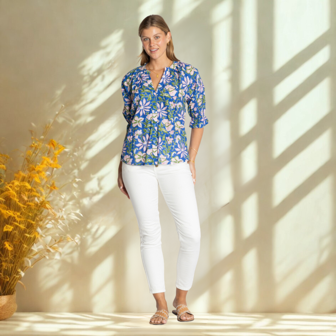 Elevate your everyday wardrobe with the IBSA Minnesota Top, crafted from 100% breathable cotton for all-day comfort. Designed in Australia, this relaxed-fit blouse features a button-through front and elbow-length sleeves, offering effortless style with a flattering silhouette. The unique printed design adds a touch of sophistication, making it perfect for both casual wear and smart occasions. Pair it with jeans, tailored pants, or skirts for versatile styling you’ll reach for again and again.