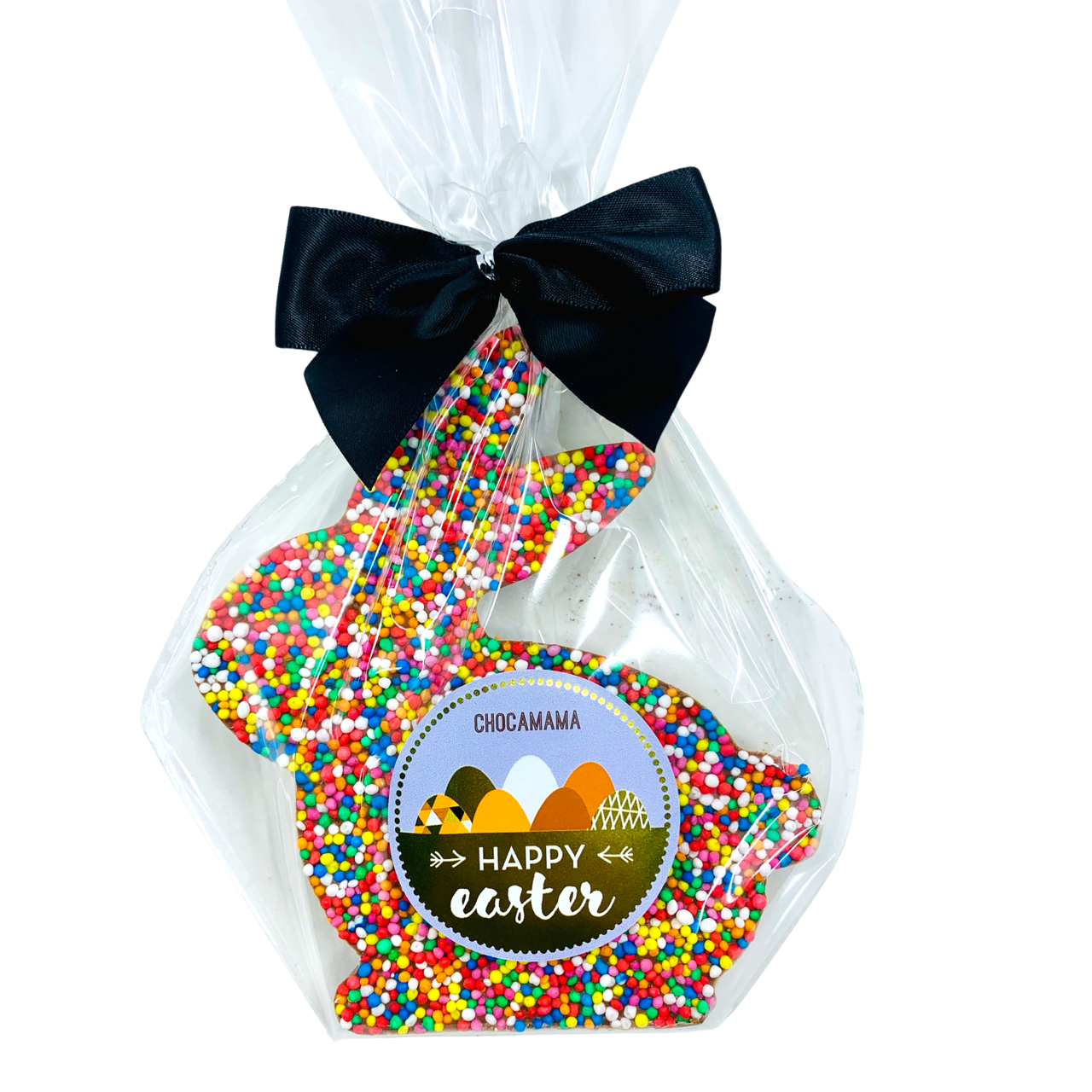 Milk Couverture Chocolate Bunny speckled with Freckles. Hop Hop Hooray. Comes in Chocamama embossed tray for protection.