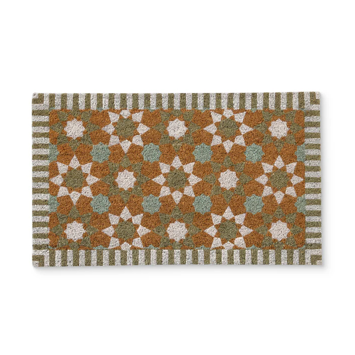 Doormat with moroccan style tile print in white, blue and green.